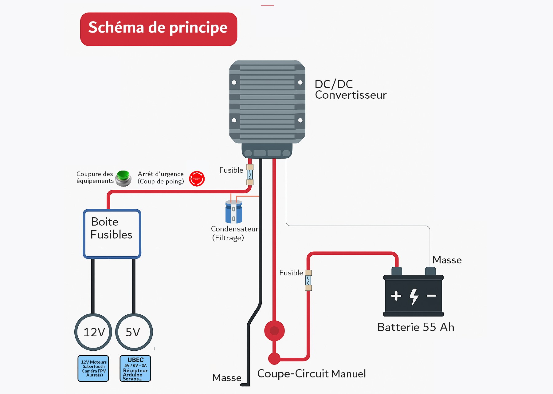 Pour l’alimentation électrique des équipements, une nouvelle ligne en 6 mm² a été tirée de la batterie jusqu’au coffret afin de partir sur un tronçon dédié. Cette nouvelle ligne arrive sur une boîte à fusibles permettant de dispatcher correctement les circuits protégés vers les différents périphériques. Comme certains équipements nécessitent du 12V (carte moteur, moteurs, accessoires) et d’autres du 5V, il a fallu faire plaisir à tout le monde et utiliser un convertisseur Buck (alimentation à découpage) afin d’abaisser la tension à 5V, destinée au récepteur RC, les 3 cartes relais, au servo de régime moteur et à l’Arduino.