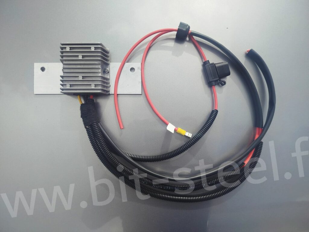 Le courant délivré par le régulateur de tension d’origine du moteur Briggs & Stratton est compris entre 10 et 16 A. J’ai toutefois préféré rajouter un régulateur de tension supplémentaire, entièrement dédié aux équipements électroniques. Celui-ci est étanche (IP67) et capable de délivrer un maximum de 20 A, se montrant largement suffisant pour alimenter les différents équipements (moteurs, Arduino, convertisseur 12V → 5V, récepteur radio, relais…).