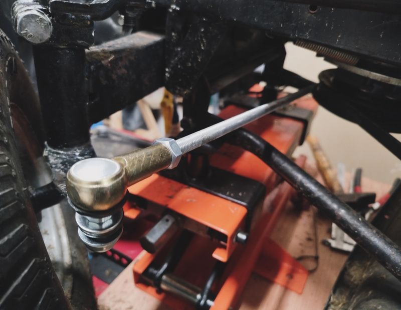 L’objectif est de retrouver un parallélisme correct, avec un peu de pincement à l’avant pour faciliter les mouvements de direction (soyons exigeant !). Dans mon cas, je suis parti sur une tige filetée Ø10 mm, recoupée à la bonne longueur, avec deux biellettes de direction vissées et bloquées par deux écrous. Simple mais efficace. Le principe est identique à l’automobile et permet un réglage fin du parallélisme. Une modification abordable qui permet de remplacer un simple fer plat avec deux bagues plastiques communément appelé barre de direction, et de réduire les jeux de près de 16 mm, apportant une précision bien meilleure pour notre projet de tracteur-tondeuse radiocommandé. Notons que le passage vers des biellettes de direction permet justement d’absorber l’ensemble des mouvements structurels de notre tracteur tondeuse radiocommandé, et Dieu sait qu’il y en a !
