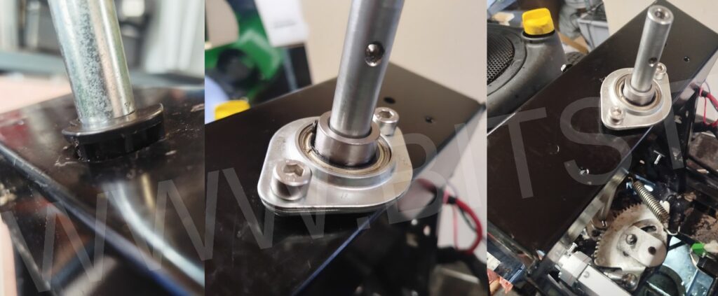 Le troisième point sur lequel je me suis penché concerne le jeu axial de la colonne de direction. Un point à mon sens nécessaire à traiter afin de conserver une tension constante de la chaîne, étant donné que la réduction moteur est fixé sur cet axe. D’origine, il s’agit encore une fois d’une simple bague plastique très dure, générant un jeu énorme et manquant, une fois de plus, totalement de précision, ce qui nuisait au guidage. Il a donc été prévu de monter un palier intégrant un roulement à billes (Ø16 mm intérieur, correspondant au tube de direction). Cela permet de limiter, voire d’annuler, le jeu, en apportant une meilleure précision de guidage et surtout une certaine constance, idéale pour la motorisation de la direction de ce tracteur radiocommandé. Sur les rares projets DIY de tracteurs tondeuses radiocommandés que j’ai vus, peu avaient pris en compte cette variable, pourtant cruciale à mes yeux.