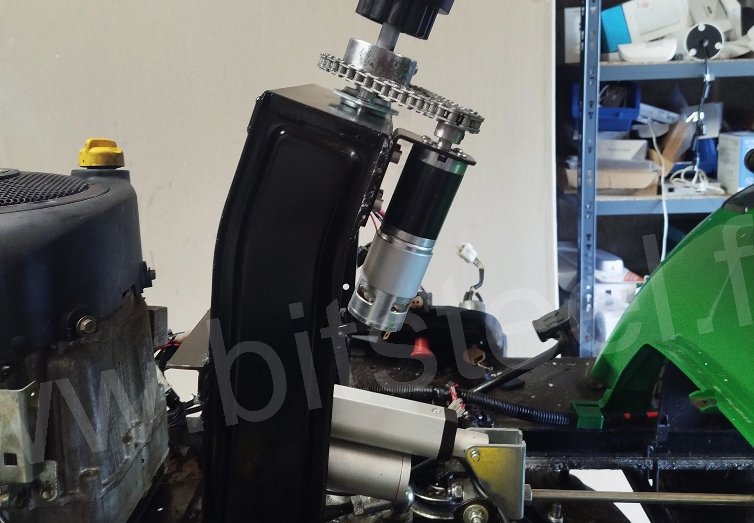 - Un amortisseur de couple pour la direction étant devenu fixe par l’usage d’un moteur réducteur.